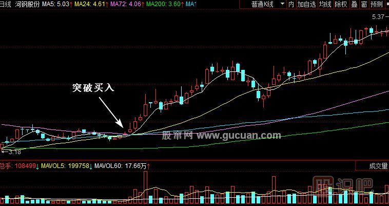 (1)成交是非常重要的一個判斷依據(jù),當5日量線上穿60日量線的時候,可以買入。