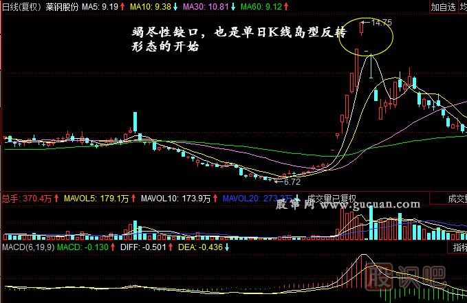 如圖所示:萊鋼股份的日k線中,該股短時間內(nèi)出現(xiàn)在頂部的跳空漲停板即該股的竭盡性缺口所在位置。同時,該股跳空缺口也是單日K線島型反轉(zhuǎn)的開始。投資者最終減倉的時機,當(dāng)然也就在于此了。后期股價快速跳空下跌后,確定了股價頂部的島型反轉(zhuǎn)形態(tài)。