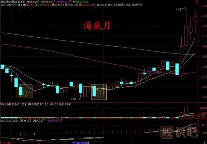 二、海底月:它的具體要求是第一天收中陰線或者大陰線,第二、第三天收上升形態(tài)的小陽或十字星,并且三天中有成交量放大趨勢的跡象。大陰線好比是一只大船沉入海底,但在底部受到強大的支撐,并有超過其下跌的能量維持它的上升,因此假如說均線系統(tǒng)是往上的,中線指標(biāo)看好,沒有理由認為該大陰線是行情的中止,應(yīng)該考慮這是主力刻意打壓造成的,因此出現(xiàn)這種情況可以認為是新一輪行情的旭日東升。大陰轉(zhuǎn)小連陽。