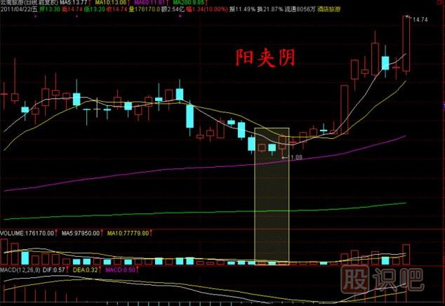 三、陽夾陰:即二根陽線中間夾一根陰線,意思是說第一天股票上揚受到抑制,第二天被迫調(diào)整,但第三天新生力量又重新介入,因此這種上升就比較可靠,后市向好的機會多。兩陽夾一陰,多方炮。