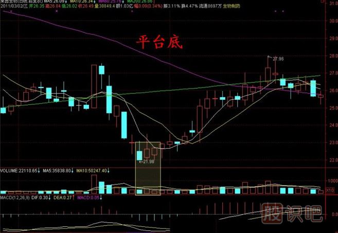 一、平臺底:股價在5日均線附近連續(xù)平盤三天,迫使5日線和10日均線形成金叉或者5日線上翹、10日均線下移速率變慢,具體的要求是三天中第一天收小陰線,第二天收小陽或小陰,第三天收小陽,整體看三根K線是平移的。三天內(nèi)小陰轉(zhuǎn)小陽。
