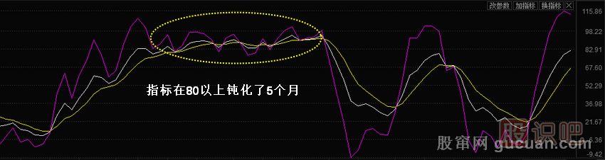 但是,在市場強勢或弱勢特征明顯的時候,會出現(xiàn)指標鈍化的現(xiàn)象,如圖2所示。指標鈍化分為兩種:高位鈍化和低位鈍化。高位鈍化是指著股價的上升,指標也會隨之上升,但指標上升的速度會越來越慢,會形成上升拋物線的形態(tài)一直在超買區(qū)域(80以上)中運行生低位鈍化則正好相反。此時,常規(guī)做多或做空的操作原則就不適用了。解決的方法可以通過使用趨勢類型的指標,以趨勢的轉折點作為操作的依據(jù)。