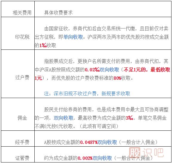 注:上述資料來源于《關(guān)于調(diào)整上海證券市場證券交易監(jiān)管費收費標準的通知》、《關(guān)于做好調(diào)整證券交易印花稅稅率相關(guān)工作的通知》、《深圳證券交易所收費(及代收稅費)明細表》