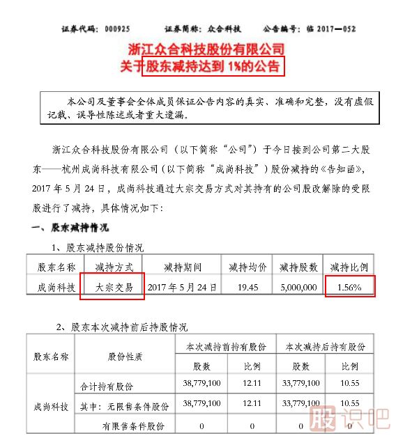 【例2】眾合科技(000925):二股東成尚科技通過大宗交易減持500萬股,減持比例達(dá)1.56%