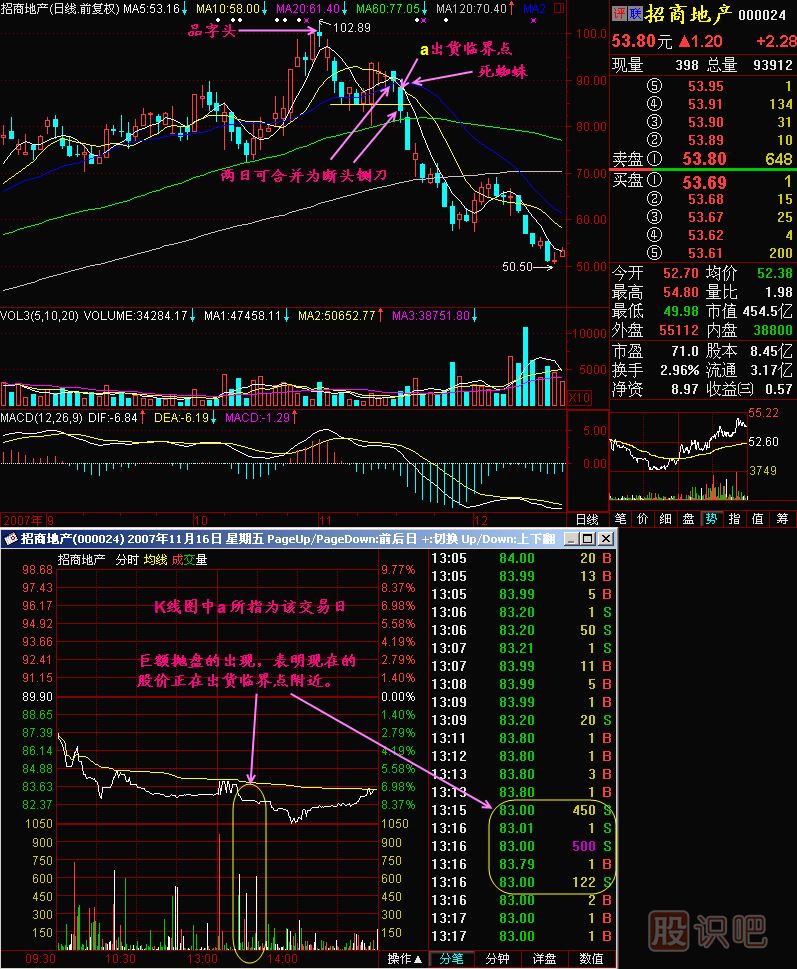 小結(jié):莊家在頭部區(qū)間出貨有一個(gè)臨界點(diǎn),這個(gè)臨界點(diǎn)之前股價(jià)是緩慢滑跌,屬于潛派發(fā),而這個(gè)臨界點(diǎn)之后股價(jià)往往快速下跌,屬于強(qiáng)派發(fā),此時(shí)股價(jià)往往出現(xiàn)了三死叉見頂、價(jià)壓、斷頭鍘刀、空方炮等等圖形,這個(gè)時(shí)候最容易出現(xiàn)巨量拋盤誘發(fā)大跌勢(shì)的情況,如果在盤中發(fā)現(xiàn)這樣的情況,可得要抓緊時(shí)間出貨,否則股價(jià)將會(huì)加速下跌,如果不及時(shí)出貨很容易會(huì)被高位套牢!