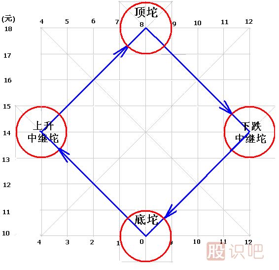 (圖285-5)將底坨2與底坨頭尾相接,得到整理后的四坨循環(huán),這為我們展示了股價從“底坨-上升中繼坨-頂坨-下跌中繼坨-底坨”的周而復始循環(huán)不息的特點。