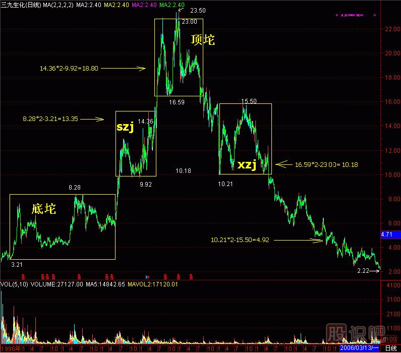 (圖285-4)是000403三九生化的日k線圖,從中可以清晰地看出“四坨”:“底坨”和“頂坨”,以及“上升中繼坨”(用SZJ表示)和“下跌中繼坨”(用XZJ表示)。