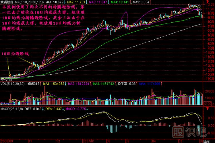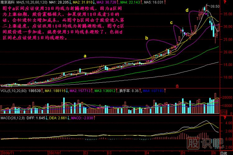 一般地說,初漲段以20日平均線為“折騰避險(xiǎn)”線,中漲段以10日平均線為“折騰避險(xiǎn)”線,末漲段以5日平均線為“折騰避險(xiǎn)”線。