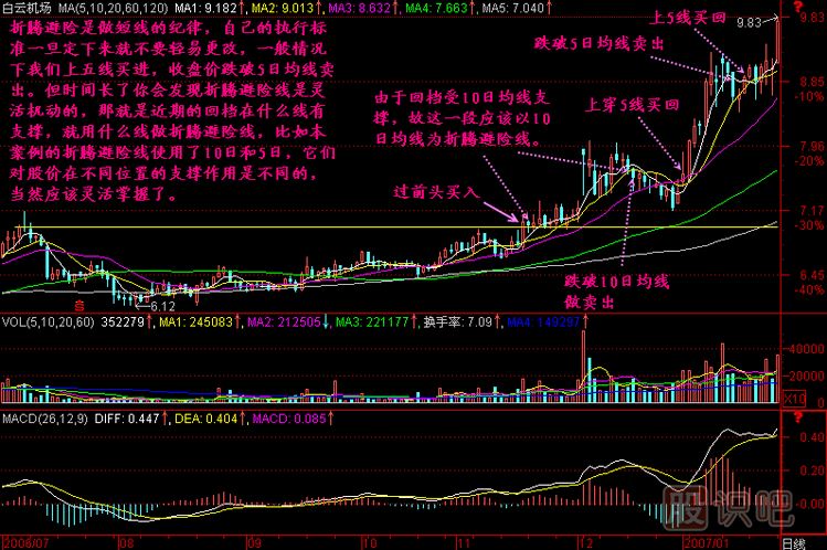 一般情況下,對(duì)于技術(shù)生疏的朋友,可以使用類似我們前面曾講過的6字買賣法來死板的操作,而對(duì)于技術(shù)稍好的朋友,也許可以靈活掌握。比如在上漲初期,由于莊家建倉(cāng)洗盤的需要,股價(jià)振幅會(huì)稍大,這個(gè)時(shí)候使用20日均線來折騰避險(xiǎn)就顯得穩(wěn)定些,避免了頻繁的進(jìn)出,這個(gè)時(shí)候股價(jià)往往是第一或者第二上漲速度,而隨著行情的繼續(xù),股價(jià)突破上升通道壓力線加速上漲的時(shí)候,就要及時(shí)把折騰避險(xiǎn)線調(diào)整為10日、甚至5日均線了,因?yàn)楣蓛r(jià)進(jìn)入加速上漲之后,一旦下跌跌破5日均線,有可能造成獲利盤蜂擁而出,如果莊家也乘機(jī)出貨,而你不及時(shí)在股價(jià)跌破5日均線處賣出的話,就被動(dòng)了,這個(gè)時(shí)候使用20日均線來避險(xiǎn)顯然就不對(duì)了,而使用5日均線可大大提高靈敏度。