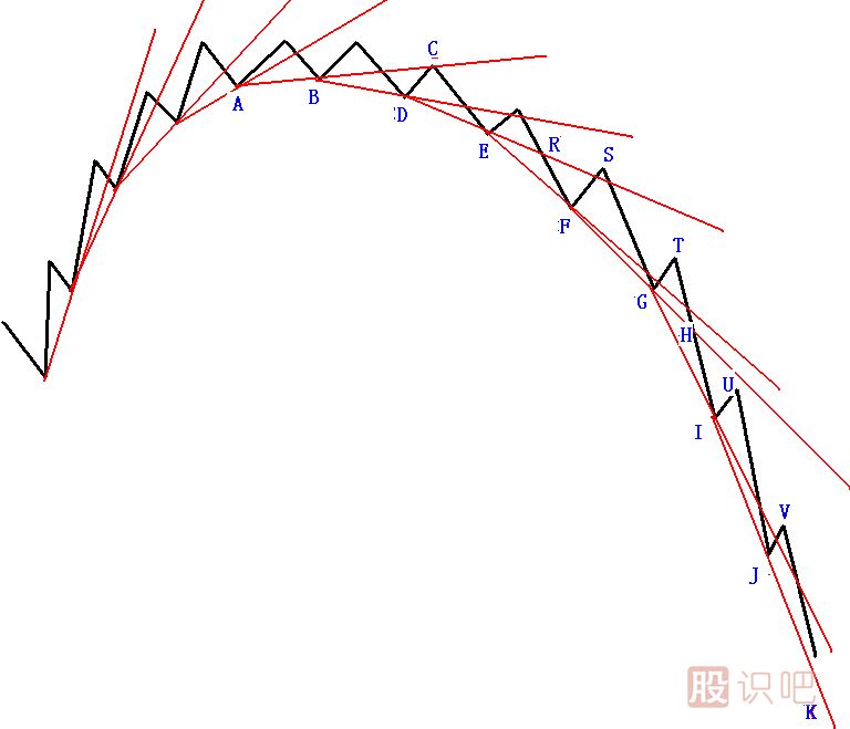 隨著內(nèi)徑線越來(lái)越陡峭地下跌,終于內(nèi)徑線變成不可能跌破之線,成為支撐線。如圖中JK線可能更陡峭,股價(jià)遇支撐可能反彈,幾次反彈,會(huì)形成股價(jià)底部或中級(jí)底部。