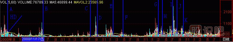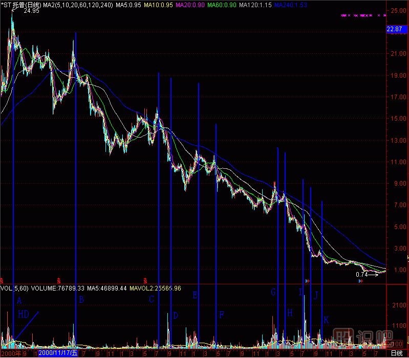 再找個(gè)股做試驗(yàn),(圖291-17) *ST托普000583的成交量柱體圖上有A至K共11個(gè)黑洞,拉起11根天線,對(duì)應(yīng)了11個(gè)頭部。也就是說(shuō),在24元處沒(méi)逃走的話,以后“黑洞”又給你10次逃跑機(jī)會(huì),只要逃,就不會(huì)遭受跌到0.74元的悲慘下場(chǎng)。