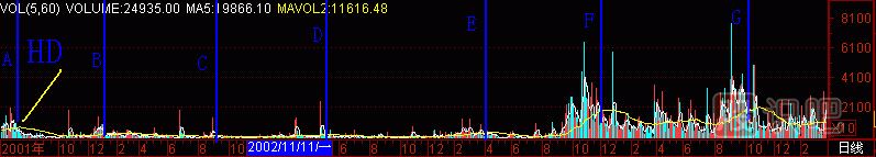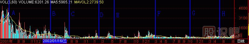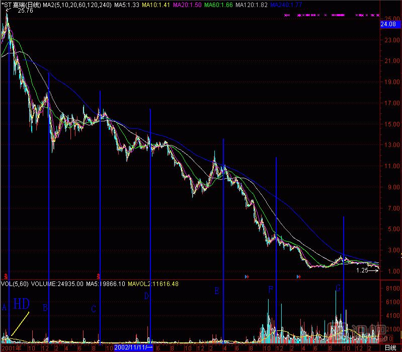 再找個(gè)股做試驗(yàn),(圖291-18) *ST嘉瑞000156的成交量柱體圖上有A至G共7個(gè)黑洞,拉起7根天線,對(duì)應(yīng)了7個(gè)頭部。也就是說(shuō),在25元處沒(méi)逃走的話,以后“黑洞”又給你6次逃跑機(jī)會(huì),只要逃,就不會(huì)遭受跌到1.25元的悲慘下場(chǎng)。