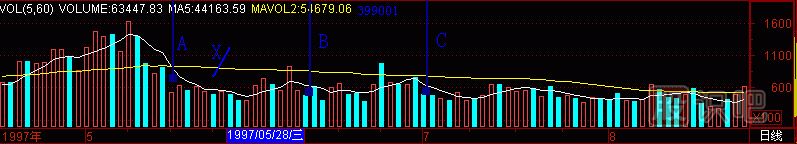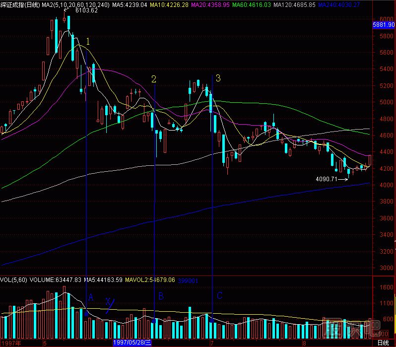也許會(huì)有人問(wèn),“黑洞”對(duì)深成指頭部預(yù)測(cè)效果如何?請(qǐng)看,(圖291-13) 對(duì)應(yīng)(圖291-5)深圳成指日K線的全圖。(圖291-13)的成交量柱體圖上有A、B、C三個(gè)“黑洞”,那時(shí),我們還不知道這成交量柱體圖是哪個(gè)股票的,現(xiàn)在明白了,是深成指的。天線A、B、C對(duì)應(yīng)的日K線圖,是:A天線對(duì)應(yīng)5日、10日價(jià)均線死亡交叉1,B天線對(duì)應(yīng)5日、10日價(jià)均線死亡交叉2,