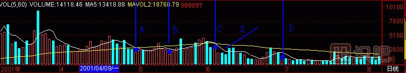 (圖291-1)中,成交量柱體圖與5日、60日量均線的空穴只有兩個(gè),這就是“黑洞”,隱藏在成交量柱體圖中,還不太好找。不過(guò),它的圖形是明確的,沒(méi)有異議的。在兩個(gè)“黑洞”上拉出“天線”,就是C天線和D天線?,F(xiàn)在我們沿著天線到K線去看看,見(jiàn)(圖291-2)。
