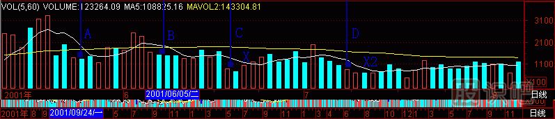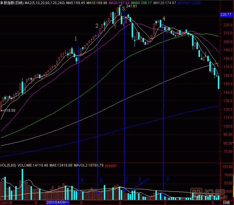 再到上海B股指數(shù)上作試驗(yàn),(圖291-15)成交量柱體圖上有A、B、C、D四個(gè)“黑洞”,各自拉起一根天線,對(duì)應(yīng)1、2、3、4個(gè)K線位置,正好是上海B股指數(shù)日K線的241點(diǎn)頭部區(qū)間,在這里清倉(cāng)是何等快樂(lè)呀!