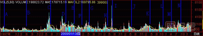 深圳成指從5091點(diǎn)跌到2590點(diǎn)的過(guò)程中,“黑洞”預(yù)報(bào)“頭部”效果如何?請(qǐng)看(圖291-14)深圳成指成交量柱體圖上有A至N共14個(gè)“黑洞”,拉出14根天線,對(duì)應(yīng)14個(gè)深圳成指的頭部。不多不少,不偏不倚,全部對(duì)準(zhǔn)。