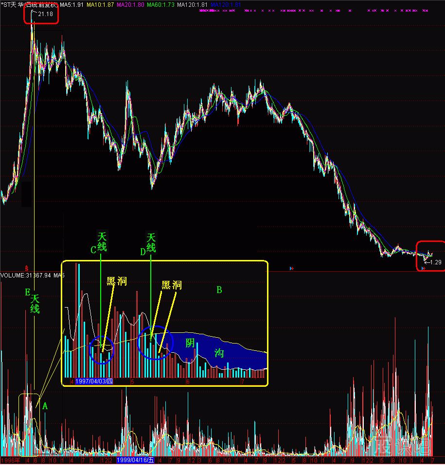 (圖291-2)中,B方框是放大了的A方框,C天線和D天線由于相隔距離很小,在A方框中,合并成E天線了。沿著E天線向上,是21.18元的天價(jià)區(qū)。E天線附近巨大的成交量無(wú)法推動(dòng)股價(jià)繼續(xù)上升,反而出現(xiàn)“黑洞”,這是明顯的出貨信號(hào)。“黑洞”以后有“陰溝”,它是5日、60日量均線的“冷空氣帶”,為了便于分別,在量均線上叫“陰溝”。“大江大河不翻船,翻船翻在陰溝里”,許多股民就是見(jiàn)了“陰溝”往里鉆,結(jié)果翻了船。由于“陰溝”圖形是跟著“黑洞”的,因此,統(tǒng)稱“黑洞陰溝”,都不是好聽(tīng)的名詞,也不是炒股的好地方,在這里炒股的人不是被“黑洞”吞噬,就是在“陰溝”翻船,難有逃脫的。