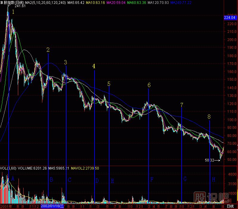 在(圖291-16)中上海B股指數(shù)的成交量柱體圖上有A至H共8個(gè)黑洞,拉起8根天線,對(duì)應(yīng)了8個(gè)頭部。效果良好。1至2中間好像有個(gè)“頭部”沒(méi)預(yù)報(bào),其實(shí)A至B之間還有幾個(gè)“黑洞”,只是規(guī)模小一些,不作重點(diǎn)分析了。