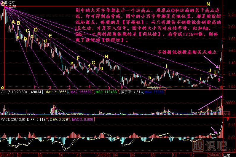 底部扇骨線繪制方法,(圖288-1):1、選一個股價起跌點(diǎn)作為原點(diǎn)“O”;2...