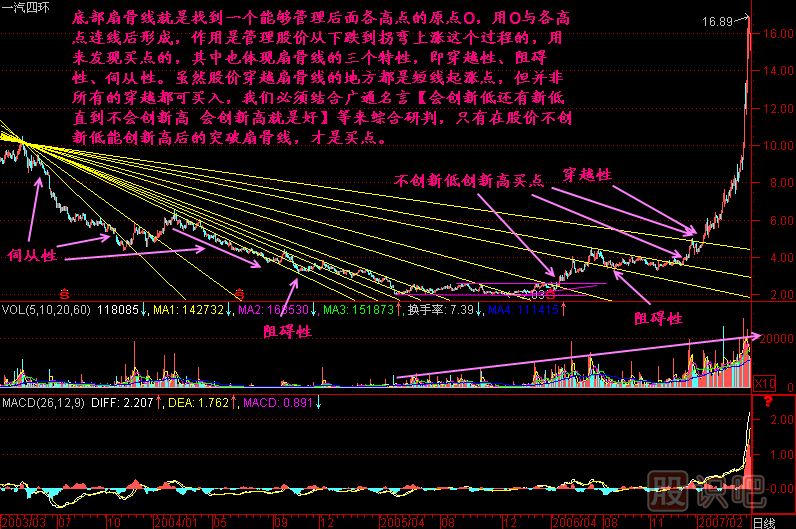 3、扇骨線的阻礙性:股價下跌過程中的每一個回檔低點(diǎn),都很難跌破過前一條扇骨線。扇骨線有阻礙下跌回檔的特性。這對我們把握回檔低點(diǎn),逢低買進(jìn)很有幫助。