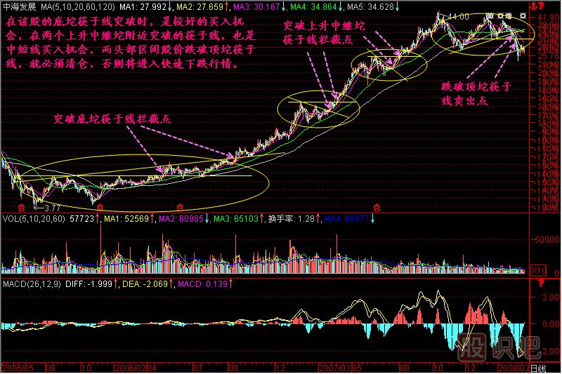 小結(jié):筷子線是依托于四坨理論展開的,只要股價(jià)形成一個(gè)坨區(qū)間,之后它總得朝一個(gè)方向突破,而一般在底坨和上升中繼坨時(shí)都會(huì)往上突破,這個(gè)時(shí)候我們就可以用筷子線予以攔截。而當(dāng)股價(jià)在頂坨和下跌中繼坨時(shí),往往會(huì)向下突破,這個(gè)時(shí)候我們也用筷子線攔截它,只不過這回是為了尋找賣出點(diǎn)位的。