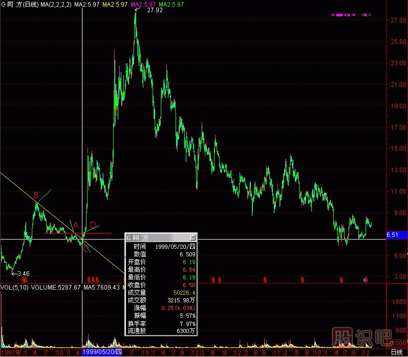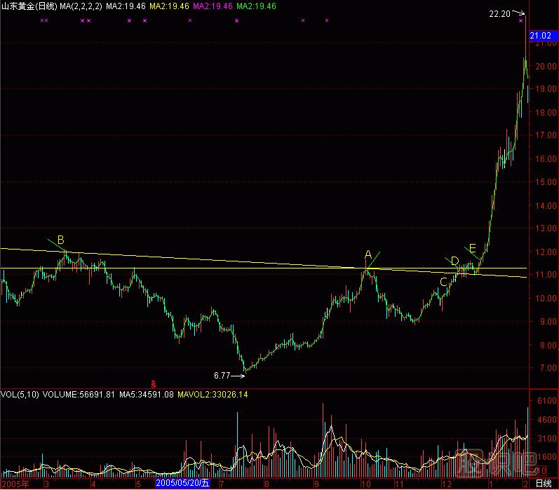清華同方的股價(jià)從B點(diǎn)的10.11元,經(jīng)過11個(gè)月的下跌,到達(dá)C點(diǎn)的5.92元,成交量極度萎縮。顯然,整個(gè)B、C和最低點(diǎn)3.46元的大三角形,是莊家收集籌碼的“底坨”,既然是“底坨”,等待洗盤完畢后,就必然會(huì)展開主升浪。從A點(diǎn)作“水平攔截線”,就取得D點(diǎn)的買入點(diǎn),用前高點(diǎn)B和A點(diǎn)作“斜下攔截線”,就取得C點(diǎn)的買入點(diǎn)。這樣,筷子線就形成了。而那天收盤后做電視節(jié)目時(shí),股價(jià)已觸及B、A“斜下攔截線”。因此判斷,股價(jià)有向上突破“筷子線”展開主升浪的可能。