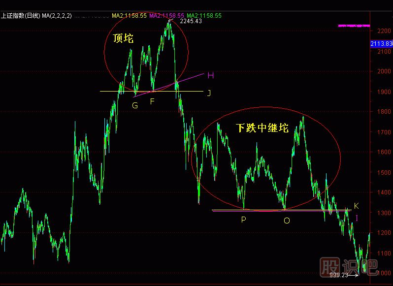 (圖286-5)是上證指數(shù)從2245點(diǎn)跌到998點(diǎn)的日K線圖。 “頂坨”的低點(diǎn)F作“水平攔截線”,得到J點(diǎn)攔截點(diǎn)。另一個(gè)低點(diǎn)G與F作“斜上攔截線”,得到H攔截點(diǎn)。這兩條線就是“筷子線”。當(dāng)上證指數(shù)從“頂坨”跌破H點(diǎn)后,發(fā)生了“坨突破”,這時(shí)應(yīng)準(zhǔn)備清倉出貨。當(dāng)上證指數(shù)跌破J點(diǎn)后,意味�派現(xiàn)ぶ甘黃�“筷子線”的支撐,向下破位。破位后的跌勢往往是勢不可擋,一泄一大截。“頂坨”向下破位這段行情,是我們必須躲避的行情,否則損失是巨大的。