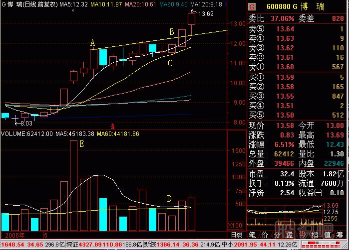 C點是回檔不破10日平均線,是強(qiáng)勢股的特征,加強(qiáng)了買入決心。E點前后是幾天巨大的成交,大成交量有可能是收集籌碼的主動性買入量,也可能是出貨時的主動性賣出量,在這里,用沙盤技術(shù)可證明E點前后的巨量,是主動性買入量,這是莊股特征。D點是橫盤到量萎縮時的成交量柱體圖,說明強(qiáng)勢洗盤接近尾聲,向上突破只是時間問題了。