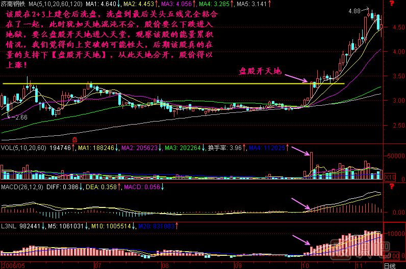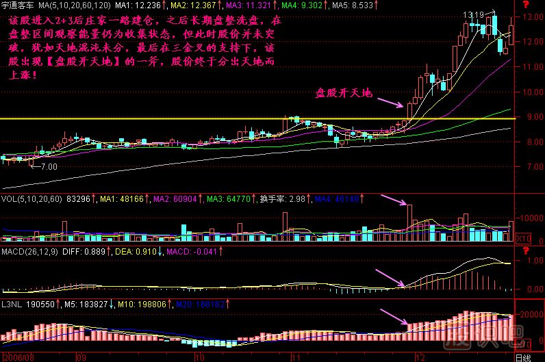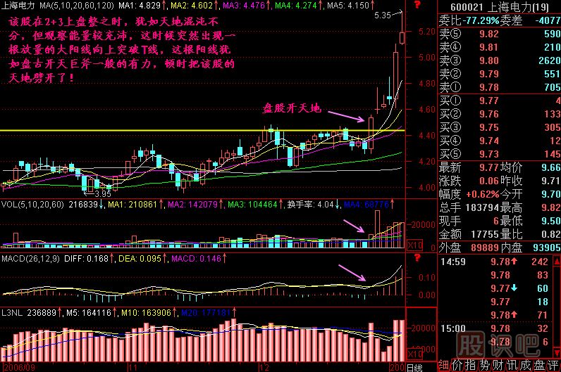 小結:一只股票在莊家建倉后往往沖入2+3區(qū)間,但莊家不想散戶在沒拉升之前跟進,也不想抬高自己的建倉成本,因此莊家要讓股價橫盤,進行沉悶而寂寞的盤整,耐不住盤整寂寞的散戶就會拋出該股而去追漲其它股票,這個時候的盤整方向不明,猶如天地混沌未分一般。一旦莊家洗盤完畢,決定啟動股價了,會推出一根突破前T線的陽線,這根陽線是上漲行情的開端,它使混沌未分的股價頓時方向明朗起來,它就稱為盤股開天地!