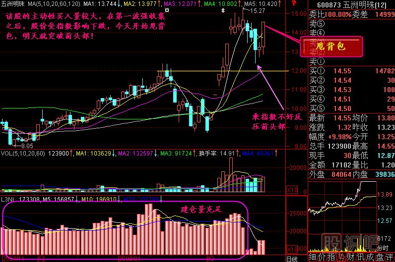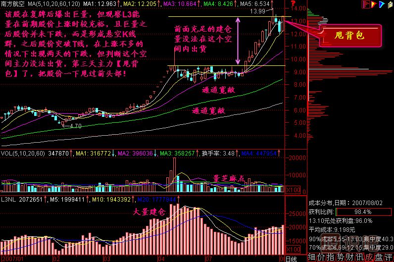 你可以想象,前幾天的幾根k線像是人頭(暫且算是頭),今天的陽線是背包,一旦用力甩出去,也能甩高一段距離。你這樣想,就不覺得股價高了,反而覺得還能買進呢。當然,在廣通是可以看到L3能量圖的,該股的L3能量充足,其甩背包后的力量將會很大。