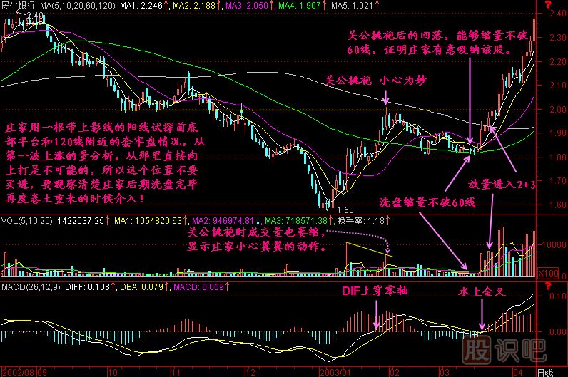 所以我們看到股價(jià)漲到2&3區(qū)間縮量靠近120線時(shí),就要明白不會(huì)馬上上漲的,因?yàn)檫@是關(guān)公挑袍 小心為妙的時(shí)候,第一次遇到120線這么大的壓力,怎么可能不放量就穿越呢?所以不要激動(dòng),要觀察,等莊家試探完畢,回落至量芝麻點(diǎn)之后再度放量攻擊進(jìn)入2+3時(shí),我們?cè)俑鶕?jù)情況買進(jìn)還來得及。
