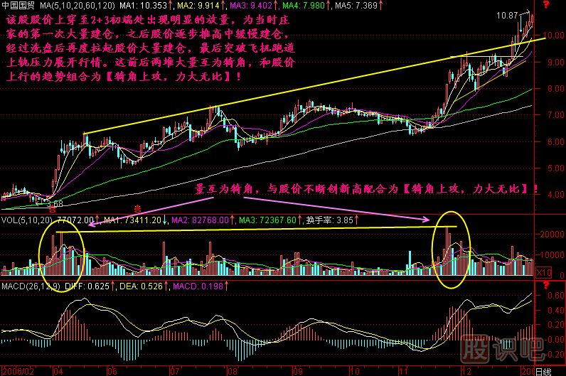 這就是犄角上攻,力大無比,這里的“犄角”主要指的是“量”,但這個“量”還必須得有“價”的配合,就是說,這個“量互為犄角”必須運用在能底部抬高,不斷創(chuàng)新高,頂緊右上角的股票上,而不能把它運用在“頂緊右下角”的股票上,這點不要亂用啊。