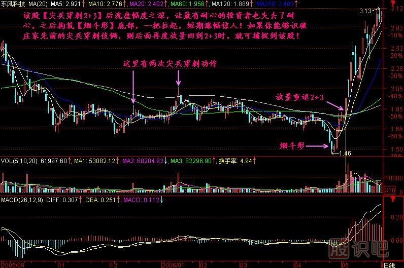 這就是尖兵穿刺2+3的市場(chǎng)行為,這個(gè)動(dòng)作往往發(fā)生在莊家底部打樁區(qū)間,當(dāng)然也可以發(fā)生在2+3之上的某個(gè)相對(duì)低位的高點(diǎn)上,在那里的話也可以叫仙人指路。