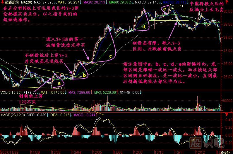 我們要看清楚a點,120下小平臺可能就要出現(xiàn)了,現(xiàn)在就要退出來,b這兒是我們切入的一個很好點位。我們上一次從日k線圖上面的底線切入,就是2.78元,那個時候是三個瞄準鏡,一號炮手、二號炮手、三號炮手,全部瞄準以后打進去!從五分鐘K線圖上價位甚至可以再低一點,不過沒什么意義,幾分錢也就算了。在b點可以切入,同樣遵循著2+3理論,就是收集籌碼,抬起來,然后橫向震蕩,把籌碼洗干凈,在c點把籌碼洗得干干凈凈,為后面的爆發(fā)準備好條件。所以我們說,股價當時沿著下降趨勢線慢慢下滑,在五分鐘圖上就是沿著這條高點連線下滑,直到把量洗得干干凈凈,這在五分鐘線上看得更清楚,洗到了最沒有量時,實際上機會就來了。
