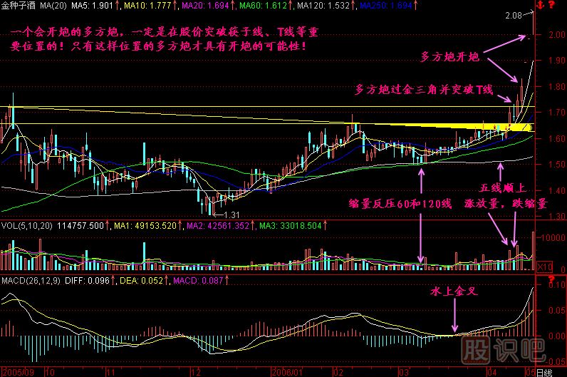 多方炮后面開炮往往有兩種情況:一種是早晨開盤后還不覺得怎樣,突然之間就拉起來;還有一種是直接跳空高開,那就是巨量跳空,回檔買進!這個圖形還有一個特殊性,就是一個長期的三角形盤整帶被多方炮突破,這個時候它推出去的力量相當大,這是一種噴發(fā)性的力量,因為那么長時間以來股價一直受到這個三角形制約,憋得很厲害,憋得它最后沒有路好走了,要么往上突破,要么往下突破??墒俏覀冎?,《十九強》跟蹤一汽轎車已經(jīng)有兩年多了,我們一直說它是莊股,大家說是不是?我們公開在中央電視臺講過,在《十九強技術》講座里講過,在網(wǎng)站上也講過,就是講一汽轎車是莊股。為什么?因為它在《十九強》里面表現(xiàn)得非常強烈,經(jīng)常處于《十九強》第一名。既然它是莊股要做上去,那就決定了它要么不突破,要突破就是往上突破,不可能往下突破。