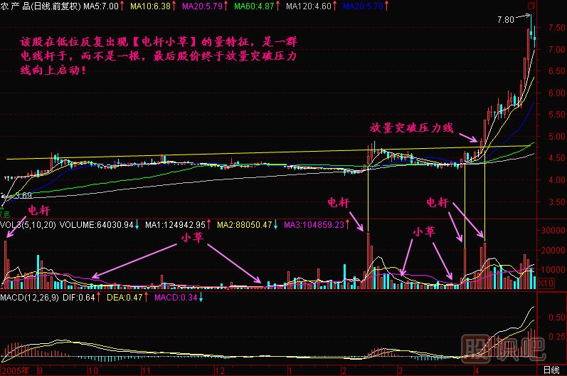 小結(jié):在低位出現(xiàn)電桿小草的成交量特征,往往是莊家大力收集籌碼的表現(xiàn),如果此時(shí)正好突破T線或者筷子線等重要壓力線時(shí),則是啟動(dòng)行情的標(biāo)志!