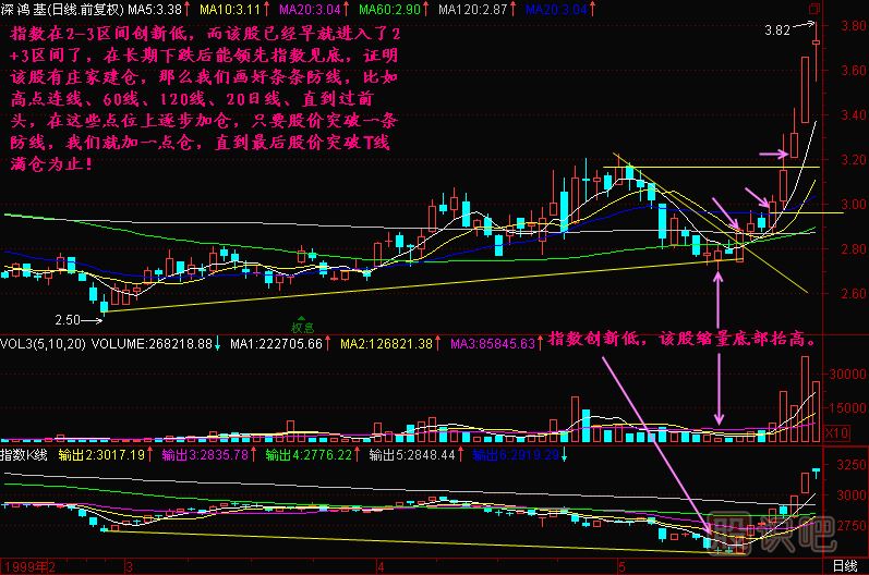 小結:在長期下跌后,指數還在創(chuàng)新低,而個股能夠不創(chuàng)新低,這就是好的表現,說明一定有資金在關照,也許就是莊家已經在介入了,對于這樣的股票,我們應該畫好條條防線來防止它成為黑馬,當然我們還有LWB能量系統(tǒng)在底部區(qū)間可以監(jiān)視到莊家的建倉行為,本節(jié)僅從股價走勢上分析。