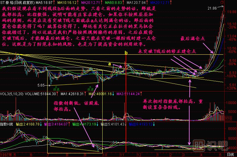 這些做法實際上是一個經驗,是我們在長期實踐之中總結出來的經驗,就是過一條線買進一部分,再過一條線再買進一部分,逐步地加倉;將來股價到了頂部往下走的時候,也是這樣逐步地減倉。有的同學又會問,我一下買進不是最好嗎?不是這樣的,這個道理我們今后再講。為什么要一層一層地買?這里面有它的科學意義和科學道理。