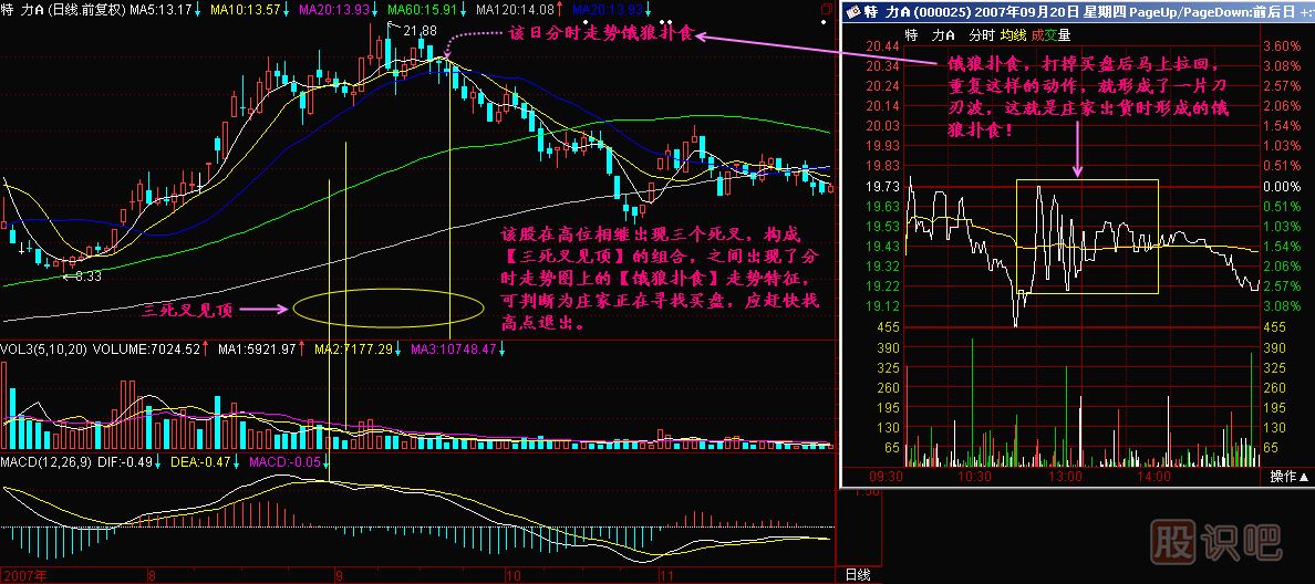 股票看盤培訓(xùn)給妳議餓狼撲食圖形特征:(1)在價(jià)格高位區(qū)月均線系統(tǒng)上如出現(xiàn)死亡交叉或價(jià)壓,往往到了莊家出貨的區(qū)間。(2)在分時(shí)走勢圖上多次出現(xiàn)直上直下的刀刃...