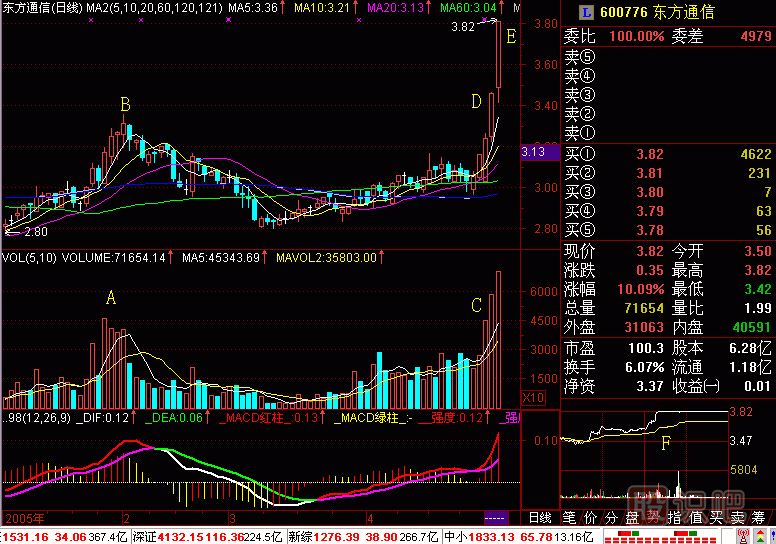 股票如何看盤分析飛碟圖274-1股改后上市第一天,不少個(gè)股巨量跳空高開,形成“股改缺口”。(圖274-1)000768G西飛高開在B點(diǎn)處,以后是沖高A點(diǎn),...