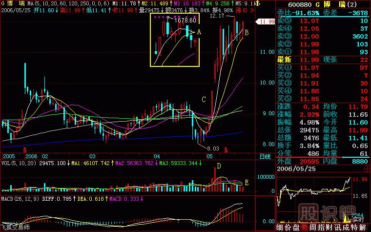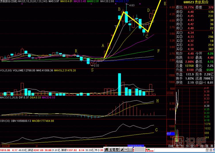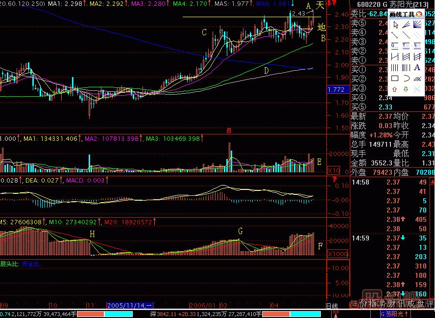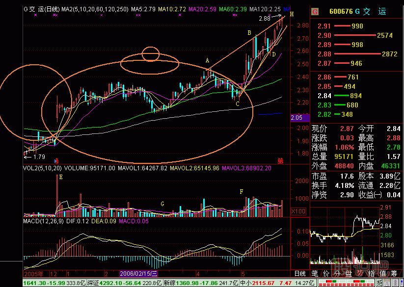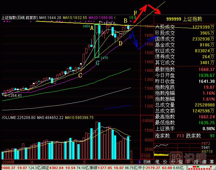 茶壺圖276-1(圖276-1)E點(diǎn)是股改缺口,當(dāng)天換手16.95%,漲16.36%,明顯有資金介入,以后連續(xù)放量,股價溫和爬高,這也是收集籌碼的跡象。G點(diǎn)是洗...