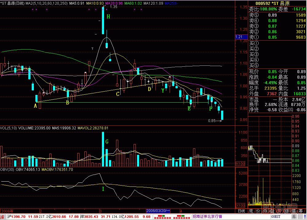 大死爪圖252-1今天000592ST昌源終于跌停板了(圖252-1)。這只個股最致命處是大死爪圖形,從D點開始,20、60和120日平均線呈“爪&rd...