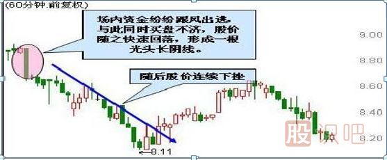 股價連續(xù)上漲后,運行至高位,突然在某個60分鐘內大拋單連續(xù)涌出,導致場內資金紛紛跟風出逃,與此同時買盤不濟,股價隨之快速回落,形成一根光頭的長陰線。此K線形成后,通常表示主力出逃堅決,短期內不再會給高位套牢盤出逃機會,個股后期走勢看淡。