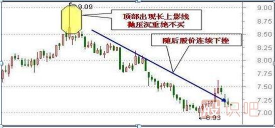 個股在上升趨勢中運行,突然某個60分鐘內快速拉升,隨后拋盤不斷涌出,導致股價回落至上一個60分鐘K線收盤價附近,留下一根長長的上影線。此K線形態(tài)意味著多頭積極追高,但高位拋壓較重,股價系那個上攀越艱難,行情很可能調頭向下。