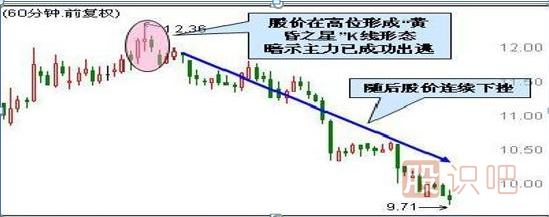 個股加速上漲運行至高位,突然在某個60分鐘內加速上攻形成一根長陽線;隨后在下一個60分鐘內多空力量達到短暫平衡,形成高位十字星;接著大量獲利盤兌現(xiàn),導致股價快速下跌,形成一根陰線。這三根K線組合形態(tài)稱之為“黃昏十字星”,通常預示著股價即將下跌。