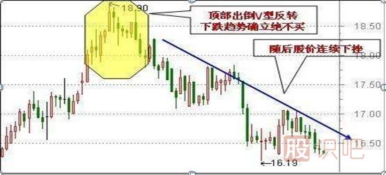 股價上漲趨勢中,由于市場看好的氣氛使得買盤強勁增多,股價上漲的速度越來越快,多頭得到極度宣泄之后,便出現(xiàn)了危機,短線客見股價上漲乏力便會反手做空,這種現(xiàn)象越演越烈,股價觸頂后便一路下跌,這樣就產生了倒V形走勢。此K線形成后,多方短期內難以再組織有效反攻,通常股價近一步下跌。
