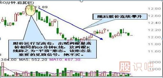 股價運行至高位,上攻受阻,拋壓逐漸加重。隨后連續(xù)兩個60分鐘K線有相同或極為相近的最高價,這兩根K線稱之為“平頂”形態(tài)。該K線形態(tài)形成后,意味著短期上攻受阻,行情摸高見頂,股價即將反轉。不過平頂形態(tài)的反轉力度較小,通常以陰跌為主。