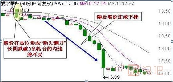 個股在高位持續(xù)震蕩整理,60分鐘K線下的3條短期均線趨于粘合,突然某一個60分鐘內拋單持續(xù)涌出,股價隨之快速下挫,一舉跌破5單位、10單位和20單位3條短期均線,并最終以大陰線報收,此為“斷頭鍘刀”K線形態(tài)。此K線形態(tài)通常預示著個股短期下跌走勢的可能性較大,遠離為妙。
