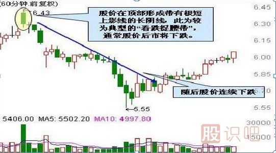 看跌捉腰帶形態(tài)是一根長陰線,它的開市價位于單位K線的最高點(或者這根蠟燭線只有極短的上影線),然后市場一路下跌。在市場處于高價區(qū)的條件下,看跌捉腰帶形態(tài)的出現(xiàn),構成了頂部反轉信號。捉腰帶實體線的長度愈長,則該形態(tài)的技術意義越重大。
