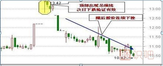 個股運行至高位,突然某個60分鐘內拋盤不斷涌出,導致股價快速回落,隨后買盤涌入,股價逐步回升至上一個60分鐘K線收盤價附近,形成一根吊頸線。此K線是較為明顯的看空形態(tài),當?shù)跏拙€出現(xiàn)的次日向下跳空缺口越大,表示下跌的可能性越大。